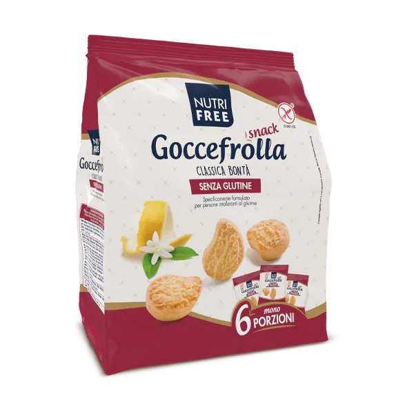 La confezione di Goccefrolla snack classica bontà senza glutine Nutri Free è da 240 g suddivisa in 6 comode monoporzioni, ideali per prevenire contaminazioni e per portare un veloce snack sempre con sé.
